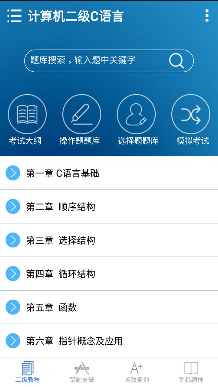 全国计算机二级C语言掌上通、完全离线的,零流量的二级C语言学习软件。 包含C语言教程(培训机构内部经典教程),C语言选择题题库,公共基础题库,非选择题题库。教程和题库实现了考点和重点全覆盖。本软件特色: