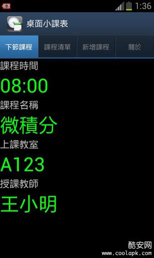 更进一步的,我们把下节课程的提示做成桌面小工具(Widget),你可以直接在桌面上放置本程序提供的Widget,不用另外开启任何App就可以看到下节课程的预告囉!