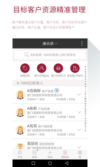 基于手机通讯录,客户管家功能帮助评估客户价值、客户关系和客户状态,客户经营情况一目了然;2、一站式客户资料中心便捷查询