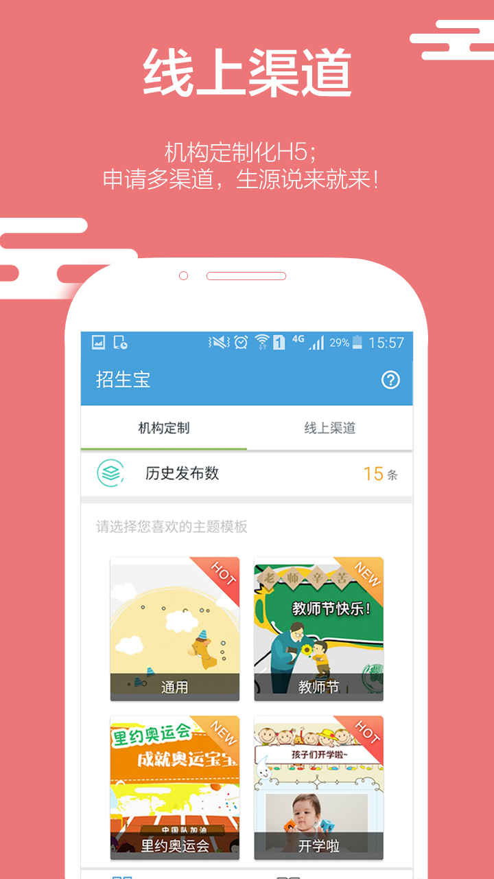 “机构定制”只要一步就可以打造一个机构专属的品牌曝光H5,并且附带报名表单,你只需要分享到微信朋友圈或者好友,就可以坐等学生找上门,我们已经完善了包括里约奥运会、秋季开学、教师节等模板;“线上渠道”是借力美团大众、糯米等优势线上渠道的强大客流,为你的机构实现引流效果;