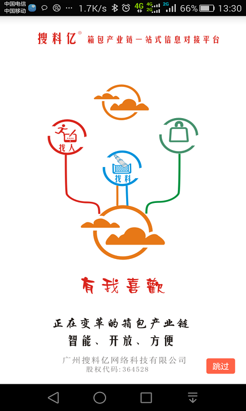搜料亿,是融合时尚、科技和专业箱包产业链全方位的移动资源对接平台,搜料亿能简单、快捷、精细地对接设计师和面料商、箱包厂和加工厂、及加工厂对接工人,实现采购与供应的“小批量、短交期和高质量”也实现生产与加工的“快加工群加工”模式,最终实现箱包行业快速,找料、找人、找包全方位服务。