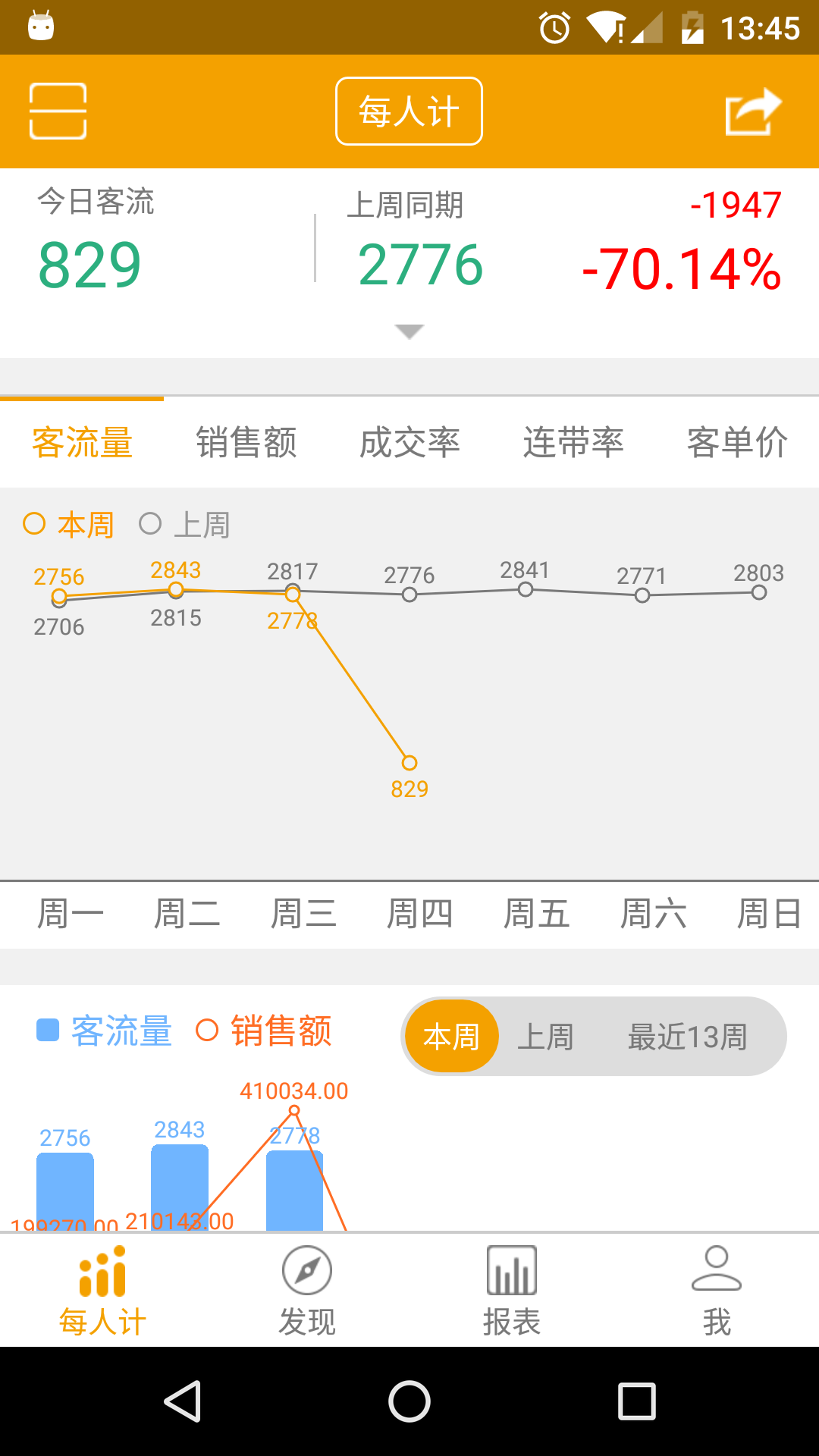 每人计APP通过分析门店智能硬件所采集的客流量数据,并结合用户提供的POS数据,可为用户提供客流量/成交率实时查询服务,从而为门店经营提供更科学的参考依据,改善门店绩效。