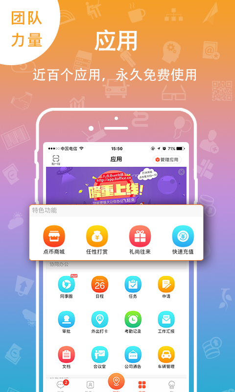 8点办,又名“八点办”, 是一款有温度的移动办公APP,奉行“有趣好玩”的理念。8点办帮助企业 /团队管理打破部门与地域限制,趣味社交,高效办公。8点办移动办公特色功能更具人性化管理,全员参与,不一样的办公体验,给员工提供一种全新的工作方式。
