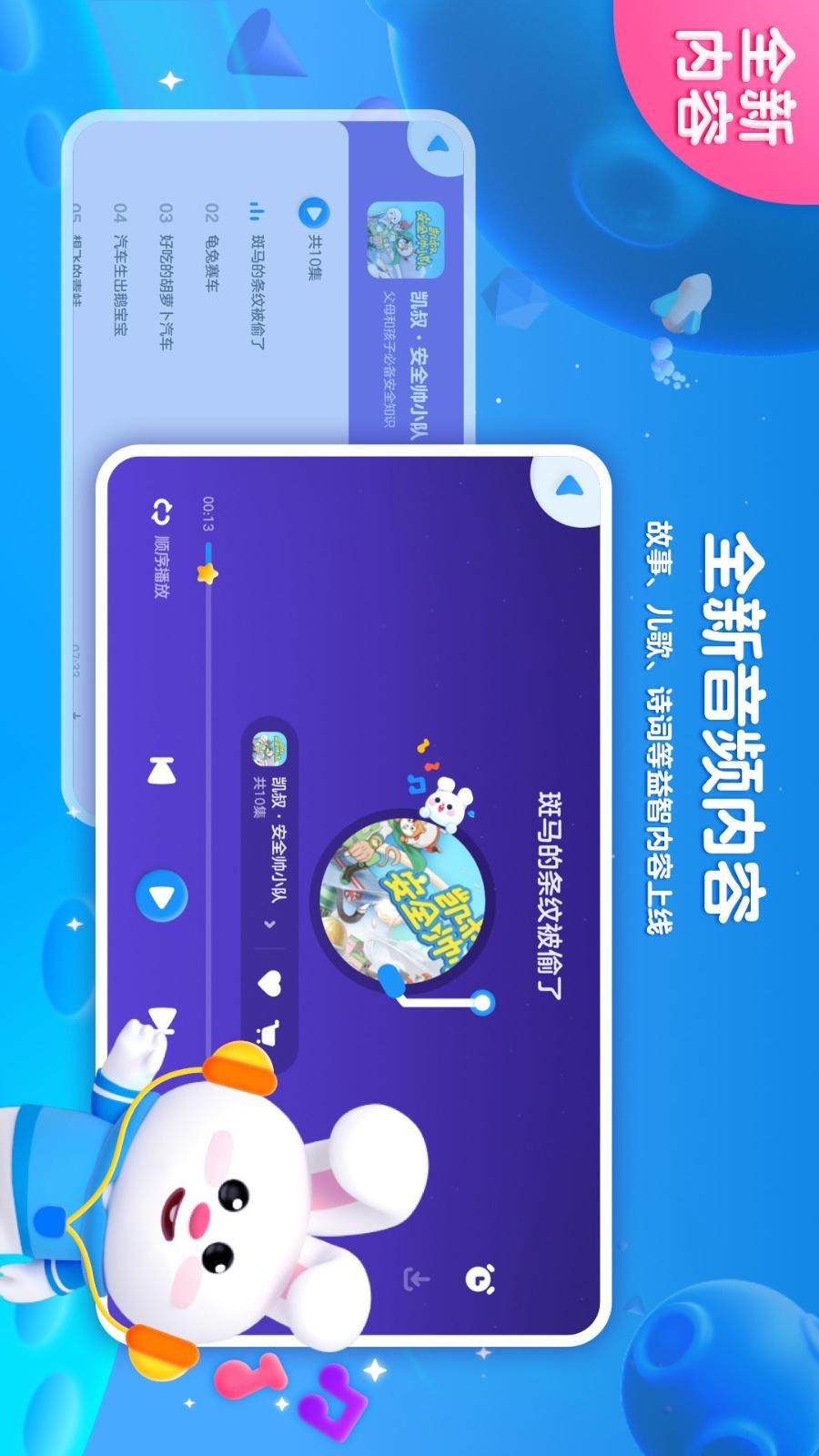 2、【音频节目全新上线】凯叔讲故事、亲宝儿歌、少儿百科知识等音频内容上线,宝宝益智启蒙、哄睡叫早的好帮手。