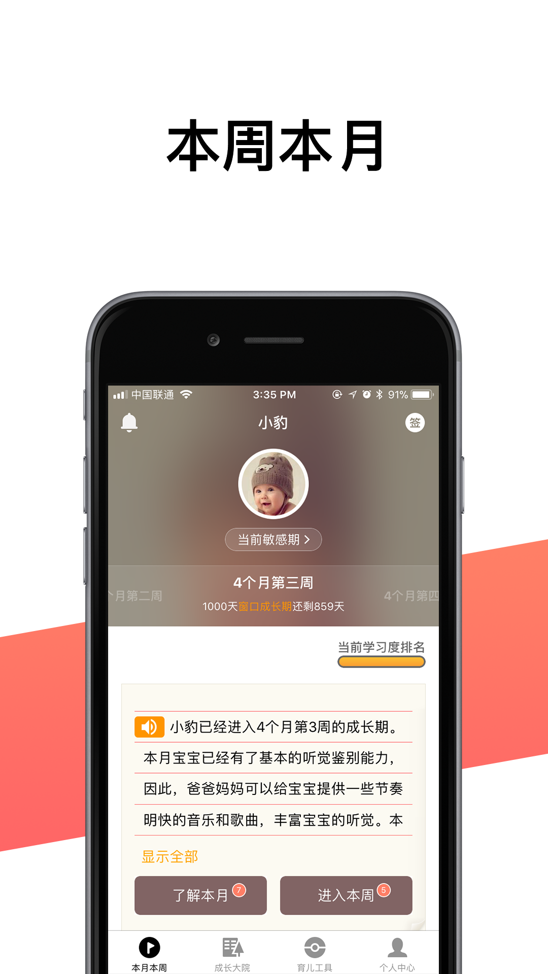 【了解本月】:对应宝宝当前月龄,推送当月行为习惯、安全管理、能力发展、健康护理知识要点,特有本月成长关注权重提示,帮助您合理分配当月时间精力,科学轻松养育宝宝;