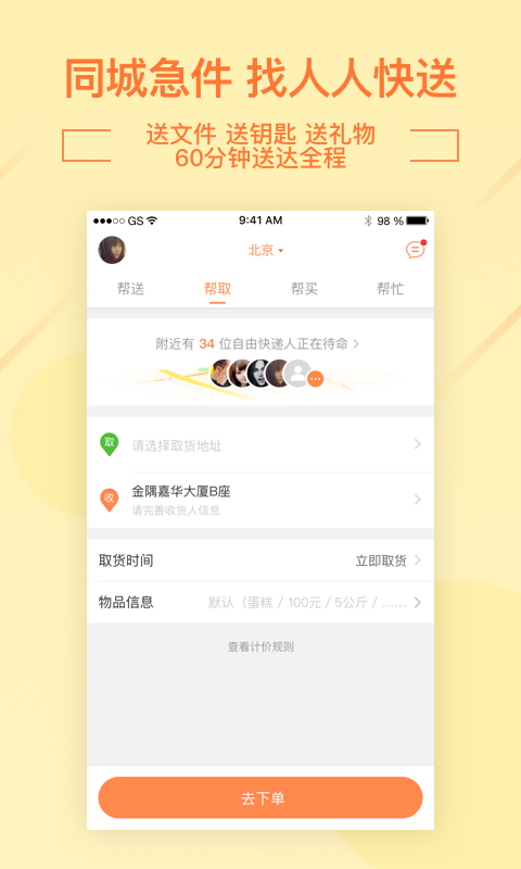 帮送:同城速递,“文件,外卖、美食、鲜花、蛋糕、水果、生鲜…”,60分钟送达全城,让快件飞起来!