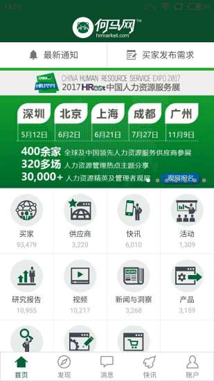 何马网(hrmarket.com)是中国领先的人力资源服务在线交易市场。何马网平台拥有数以万计的人力资源相关产品、服务、解决方案,以及丰富多彩的人力资源管理主题论坛、研讨会、培训等活动。何马网不仅能够为人力资源服务供应商提供强大的整合营销服务、相关的软件、技术支持服务,而且也是企业提升企业品牌影响力、进行产品与服务大规模宣传和推广、获取销售线索与销售机会、优化客户服务水平、高效管理市场活动的平台。同时,何马网还为数以百万计的人力资源经理人提供强大的供应商管理系统(VMS),帮助他们有效地管理供应商并进行购买决策,大幅降低采购成本。