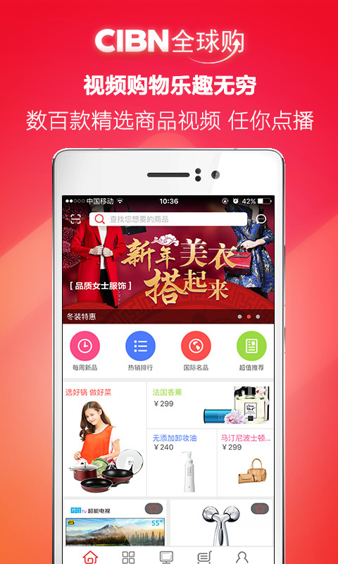 CIBN全球购是国内最专业的以“视频购物”为主的电商平台,用户可通过家庭互联网电视及移动手机终端,尽享独特的视频购物乐趣。平台商品涵盖了服饰、美妆、家居、家电、数码、食品、保健等10余品类的优质品牌商品,支持400电话订购、货到付款、在线支付等多种方式。同时以跨境电子商务模式引入国际知名品牌商品,全面满足家庭每一位成员的不同购物需求。