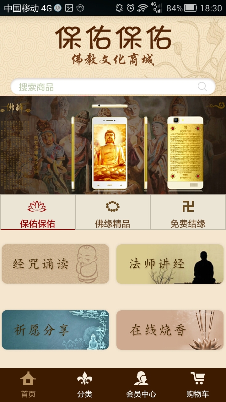 【产品简介】保佑保佑APP是由广州商易通科技有限公司独立研发的,是一款集佛教音乐佛教视频于一身的综合性APP,用户可以在APP上实现在线购买优质的佛家物品【产品特点】【首页】 -佛教音乐佛教视频的在线播放及佛家物品购买;【分类】 -佛家物品的分类;【购物车】-对佛教商品实时管理【会员中心】-详细罗列实时余额,易通币明细【联系我们】官方网站:http://www.baoyoubaoyou.org