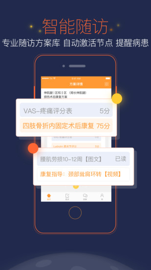 医数是骨科与康复专业领域的病患管理平台。医数为医生提供病患管理工具和随访数据采集服务,也为病患提供医疗患教内容和医患沟通渠道。医数提供的病患管理模式是:预先设立单病种管理方案、建立医患关联、推送随访量表和患者教育内容、提供康复指导。