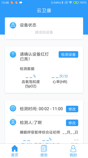 8、实时测量:“云卫康”连接舒气通设备或者其它设备后,可从App端发起实时测量,进行体征数据的采集和展示。