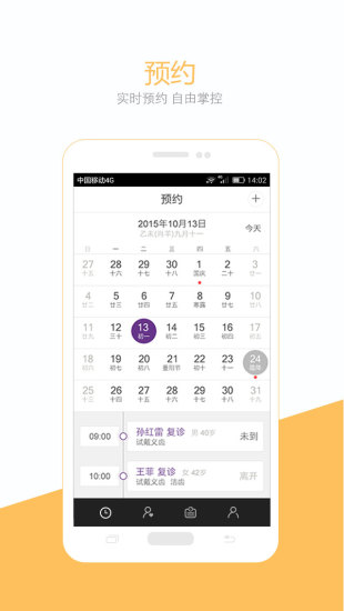 全景预约管理功能:当天预约、本周预约、本月预约的全景呈现,可以让医生按天、周、月查看预约时间、预约事项,进行诊治事务安排,不再为预约管理而烦恼;