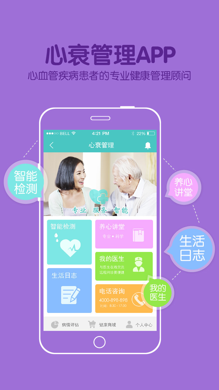 心衰管理APP是一款专为心衰和心血管病人服务的APP,依托强大的后台云服务系统和专业的医师团队,让患者足不出户就可以获得专业的医师咨询服务和护理指导建议,减少不必要的就医次数。帮助心衰高危人群预防心衰,帮助心衰患者在家自我监测、自我管理,从而改善症状、延长寿命,是心衰患者和高危人群触手可及的专业健康管理顾问。