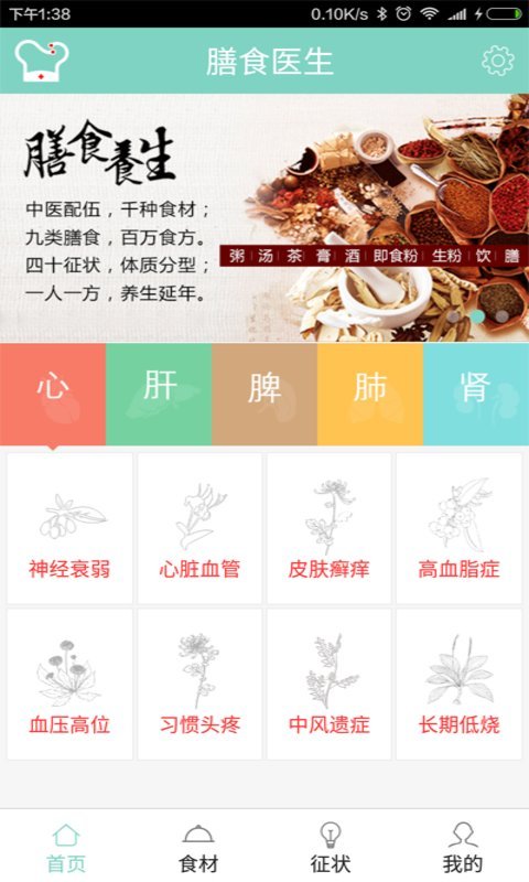 膳食医生按人体五脏分类,每类包含八个身体征状,共计四十个身体征状,都是当下热点征状及老慢病。