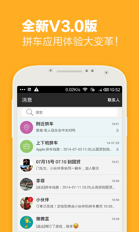 3.为拼车定制的即时通讯----在沟通过程中完成下单操作,简单易用。支持语音对话、位置共享。