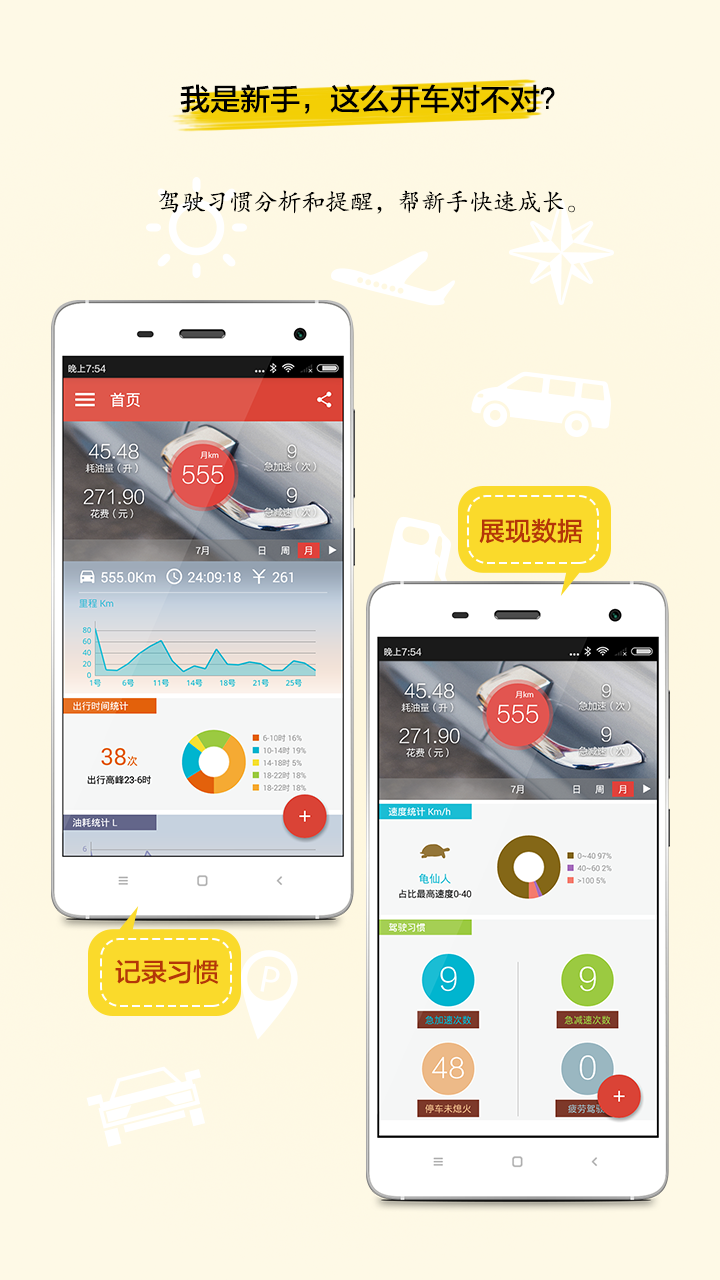 驾驶习惯分析和提醒,帮新手快速成长。