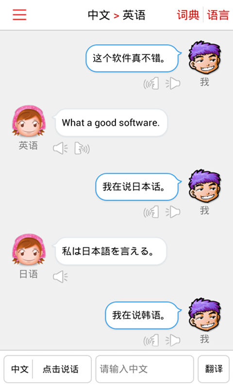 想不想随身配备一位专业的同声传译专家?同声翻译超级版满足您的梦想,无论你是否懂各国语言,只要你对她说话,她会立刻将你的话翻译成外语并朗读出来,同时支持手动和语音输入。强大的智能翻译功能,无需您选择需翻译的语言,省去繁琐的设置,自动识别输入文字。强大的同声翻译体验,配以简洁有趣的对话模式,快来下载体验一把超酷的翻译感受吧。六大特色等你发现: