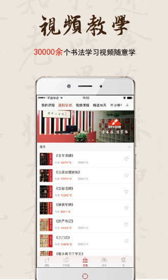 在线学习书法视频课程、赏现代名家名作,遍临海量高清碑帖,习作拍照原贴比对,玩转各式书法集字,获取文化部专业书法人才等级证书,书法学习如此与众不同!