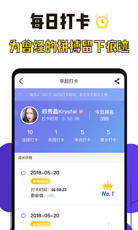 1. 早起打卡新增奋斗历程,周榜,月榜。(Tips:连续打卡勤值更高)