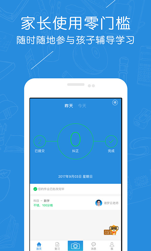 一、拍照纠错。每天拿手机轻轻一拍,上传作业,1小时内即有老师完成批改。
