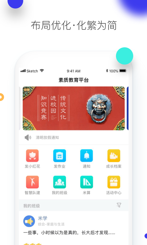 素质教育支持发布通知可查看家长阅读情况;图文结合发布作业;班级群聊、自建小组聊天、单聊等等。