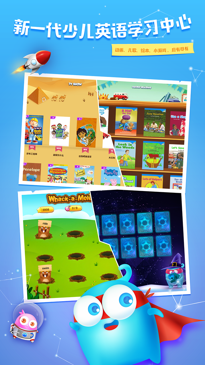 “英语总动员”有儿童学英语所需要的一切。它为你带来最成体系的美国原版英文阅读,纯正欧美儿歌,充满乐趣的自然拼读, 活泼生动的睡前故事,量身订制的分级阅读,寓教于乐的英语小游戏,丰富全面的小学英语单词启蒙,上百部的英文原版动画片。这里不仅有美国加州小学教材,还有来自迪士尼的闪电麦昆,冰雪女王爱莎,长发公主,玩具总动员的巴斯光年带你学英文看绘本;有小猪佩奇、托马斯和他的朋友们、爱冒险的朵拉、小马宝莉、芭比、和芝麻街动画英文原版呈现边看边学。