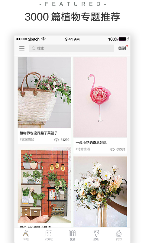 全球达人跨界,每日精选推荐,聚合原创图文视频内容,随时随地获取植物美学信息。专题涵盖花艺、园艺、家居超过3000篇精品专题。