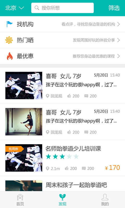 有了熊孩子,家长可以基于地理位置查看教育机构点评、体验课、优惠信息及周末亲子活动;