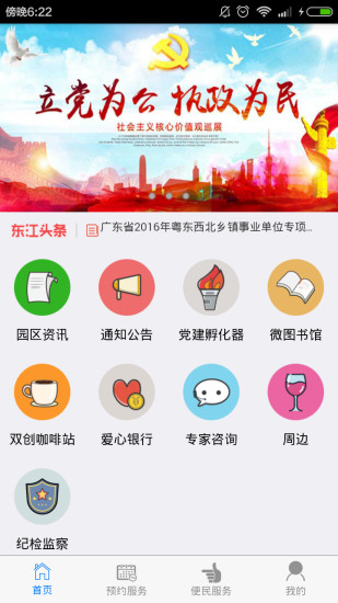 “智慧东江”党建APP由东江高新区党委办公室订制开发的一套集园区资讯、通知公告、党建孵化器、双创咖啡站、微图书馆、爱心银行、专家咨询服务及周边栏目等多种党务应用为一体的综合手机应用平台,党员同志可以通过“智慧东江”党建app快速了解园区党建动态,通知公告,方便交流学习等,欢迎来下载使用!。