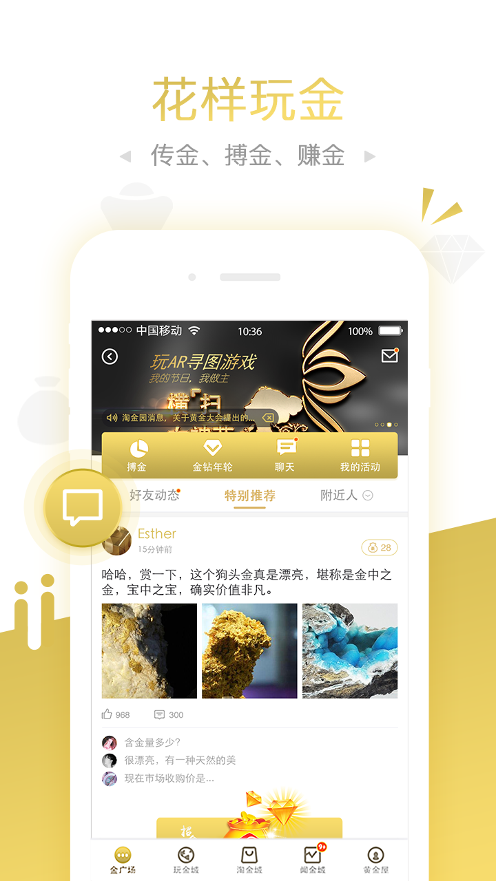 淘金园,天天赢黄金。一个用手机寻图就能赢取黄金钻戒的游戏乐园,抢黄金红包、做黄金投资、定制金饰、相约金钻女神、直播资讯,好玩内容等你发现。