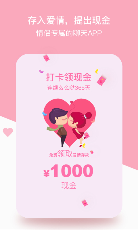 爱情银行,一款送现金的情侣专属聊天APP。注册即送现金红包,热恋期间还有多重惊喜,与伴侣亲密互动可获红包奖励,互动满一年还能乐享千元专属爱情基金。存进爱情,提出现金,越爱越甜蜜!