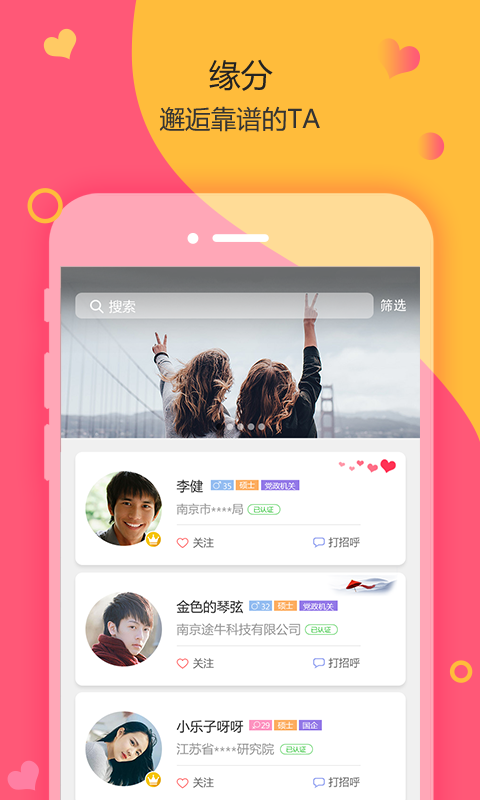 “掌缘”是一个以单位为基础的移动婚恋交友平台。为解决诚信不足的问题,提出单位认证、同事认证等系列认证体系,增强了单身男女之间的互信。同时,创新性的将传统线下单位单身联谊会模式搬到了手机上来,让条件相当的单身群体实现“门当户对式”的交友。目前,平台上云集了各大主要城市的工会、团委、妇联等组织的单位联谊会 ,注册了大量有社会责任感,负责任的政府机关、大型企事业单位、海外华人团体,是700万单位、6000万单身群体的共同选择,已经成就了相当一部分人的美好姻缘。掌缘针对枯燥的传统见面模式,创新性的将社交功能融入到婚恋交友中,让单身朋友亲身参与到各种线下活动,再进入相同兴趣群中充分沟通了解,从而极大的提高了配对的准确性和成功率。