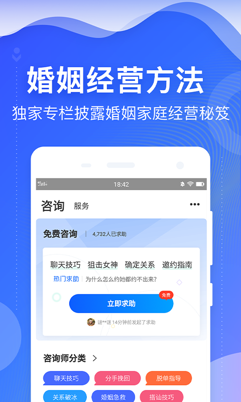 1200万用户情感之路上的不二选择,入驻300+专业团队,上千名心理咨询师、恋爱达人、婚姻家庭咨询师指导你走出情感困境,我们竭诚为您服务~
