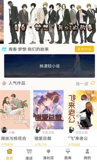漫画打榜撒钱模块。喜欢画漫画的文艺青年,可以上传分发自己的漫画作品,参与打榜赢奖金活动。每周开榜,现金直达。