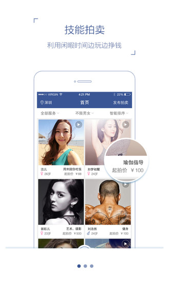 目前提供休闲娱乐、美女模特、运动健身和旅行等品类,满足你约饭、约跑、街拍、业余导游等需要。