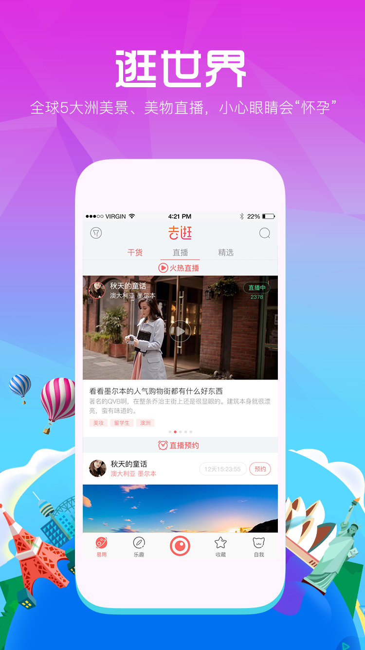 “去逛”是一款海外直播购物APP, 来自全球各地的达人们不仅为你介绍当地热推商品,提供优惠购买渠道,还会将自己生活中的点点滴滴分享给买家,增加自身的真实性。作为一款海淘直播互动产品,“去逛”联合全球直播达人,带你逛遍世界的大街小巷~