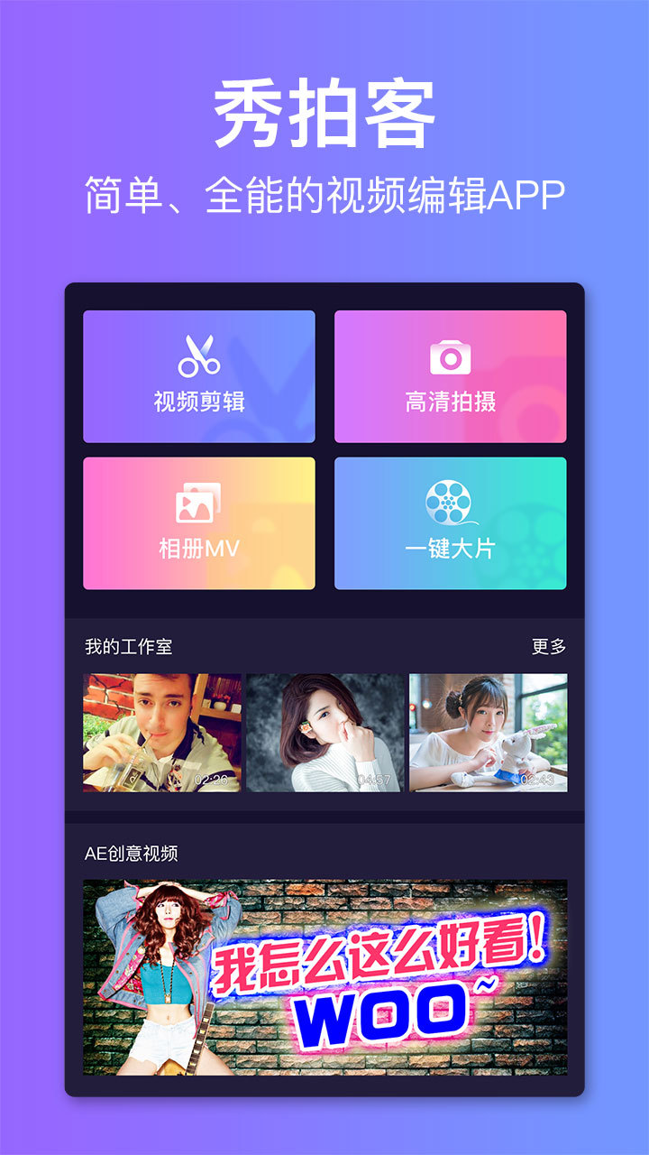一款让您分分钟作生活导演的手机拍摄软件! 秀拍客给你随手录制、自由编辑、配音配乐、画面效果、资料管理等功能。还有不断更新的各种精选素材,让你轻松做出属于自己的个性影音回忆,还能一键分享。加入快秀,给自己、家人、朋友随时的精彩。