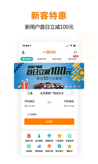 下载一嗨租车APP,享有优惠活动与贴心的服务,来一场说走就走的自驾游旅行!