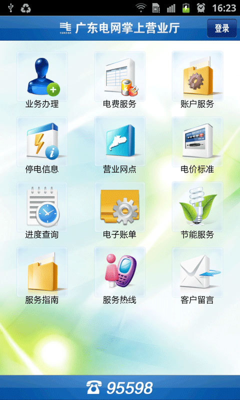 广东电网公司是中国最大的省级电网公司,服务客户数近3000万户。本应用面向广大电力客户提供移动在线服务,满足客户随时随地,足不出户享受便捷的用电服务的需要。应用功能包括营业网点定位、业务办理、电费查询、在线缴费、电子账单、进度查询等,其中网点定位服务可以利用手机的定位功能配合电子地图实现查询营业厅及自助服务终端服务状态,方便客户选择就近的营业厅或自助服务终端;充电设施功能可以方便用户寻找就近的充电站;业务办理可以提供用电客户在线申请新装或者进行业务变更的服务;电费查询可以查询多月历史账单详细信息,并可以进行多月电量电费趋势图分析;在线缴费功能目前支持实时银行划扣和充值卡缴费;电子账单服务提供电子账单的开通和变更功能,用户可以在线取消纸质账单,使用低碳环保的邮件电子账单或者短信电子账单;进度查询可以根据手机号或者工作单号、网上申请号查询申请业务当前办理情况。另外,系统还提供电价标准、停电信息、节能常识、服务承诺、服务资讯、常见问题解答、客户留言及历史留言查询功能。 说明: 其中手机短信接收信息,仅限于广东省内手机用户。其中的服务热线功能,可通过点击界面上的95598按钮拨打95598供电服务热线来接通广东电网客服座席,寻求自动语音或者人工服务。