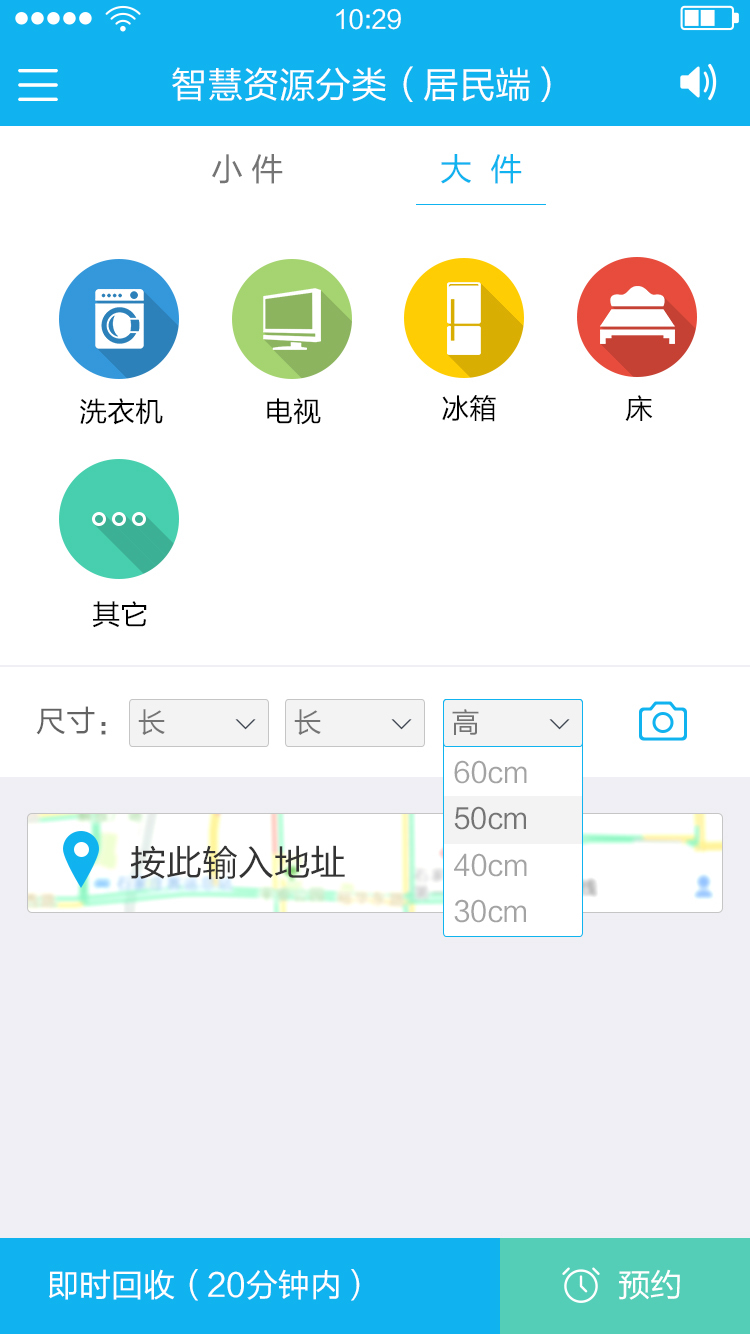 拍照及尺寸选择:大件可以通过尺寸选择功能,及排照功能让环卫工作者了解其回收物品的概况,从而选择合理的回收工具。