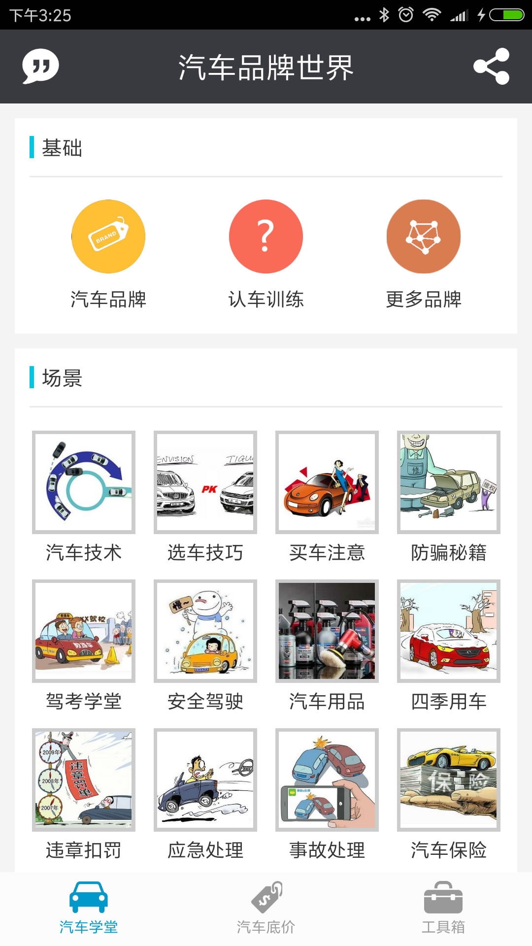 主要功能包括汽车品牌、用车场景、认车训练、世界知名品牌、汽车工具箱等。