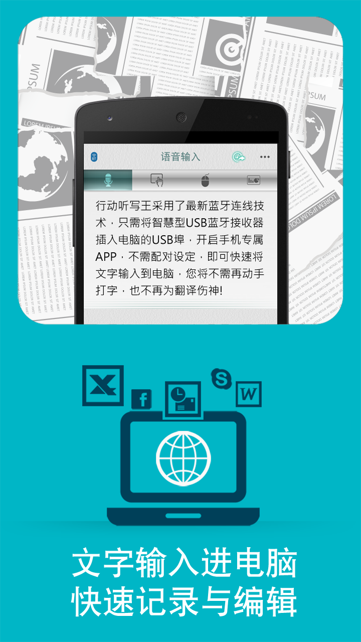 您只需对着手机开口说话,即可将口说内容转为文字及标点符号,直接输入至计算机上的Word / PowerPoint / Email / Facebook等应用程序,每分钟可输入高达200字,让您轻松纪录与编辑。此外,行动听写王亦支持手机手写及键盘输入,让手机屏幕化身为无线手写板,大大提升您的工作效能!