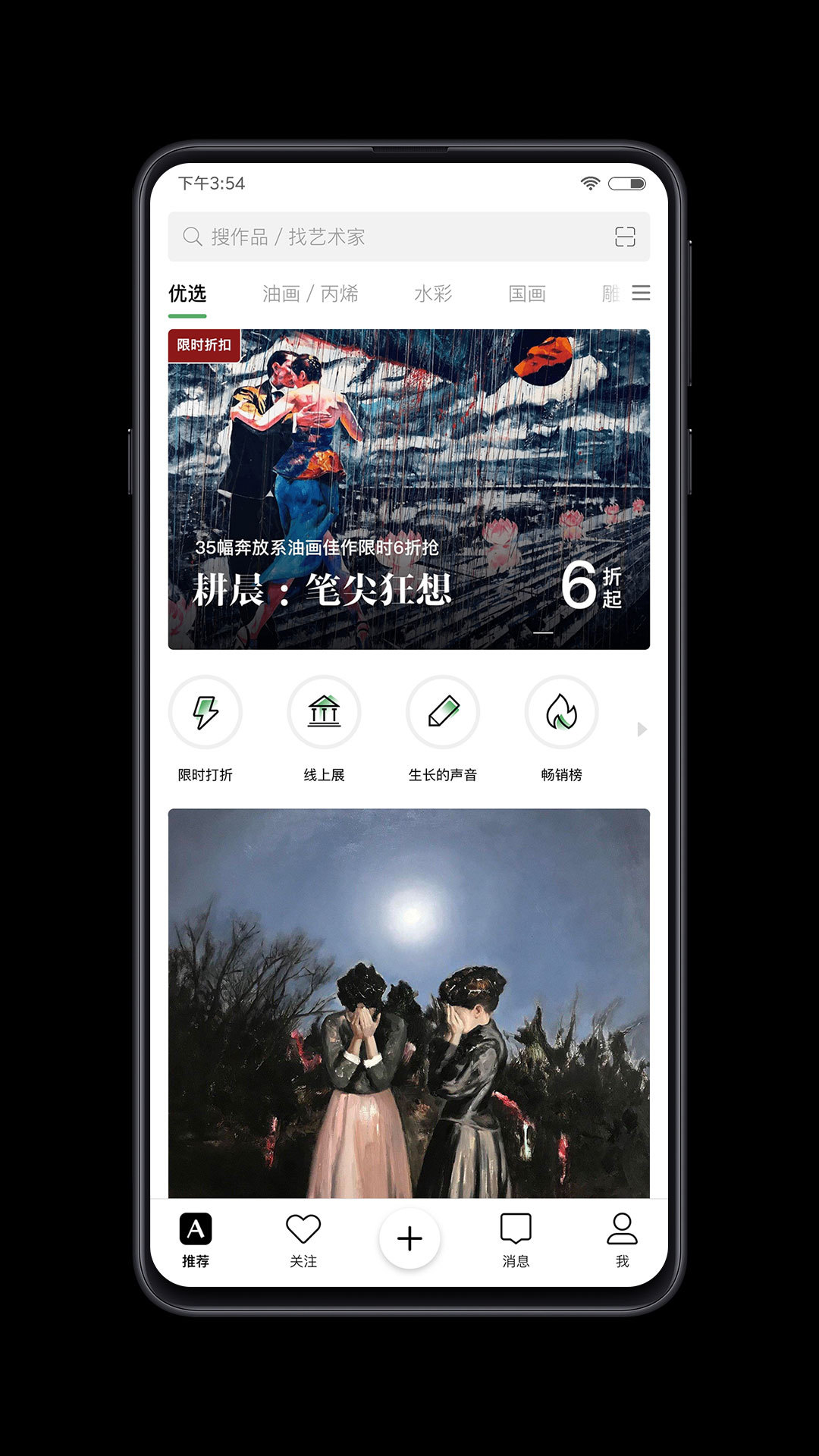 - 用户可以搜索、关注艺术家,或私信互动、交易购买;