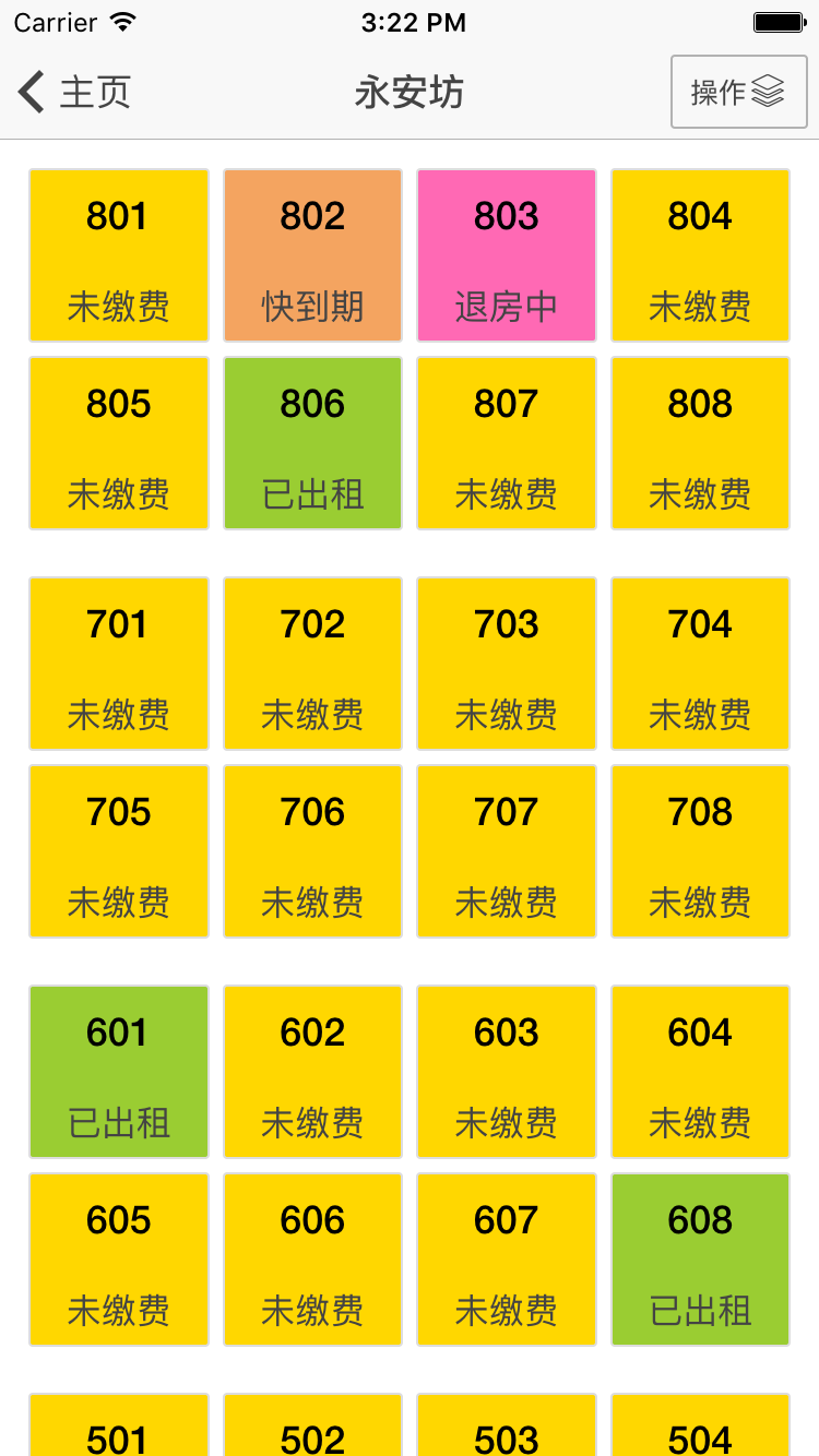 3,房间主页面中,区分未缴费,即将到期,退房中状态,并用不同颜色标记