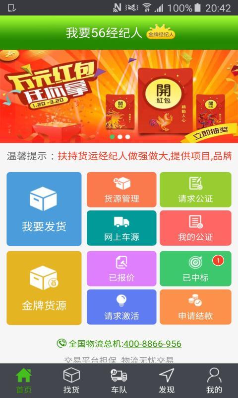 我要56经纪人是一款专为公路物流行业从事人员提供的专业物流找车、配货软件,平台特有的林安-担保模式,为平台客户找到优质、放心的车源提供了保障,另外,平台还为经纪人带来了货源信息。