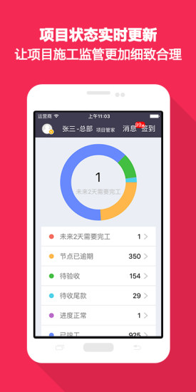 项目进度分类:对项目经理/工长参与的项目进行分类展示(施工中/待验收/已延期/已竣工);