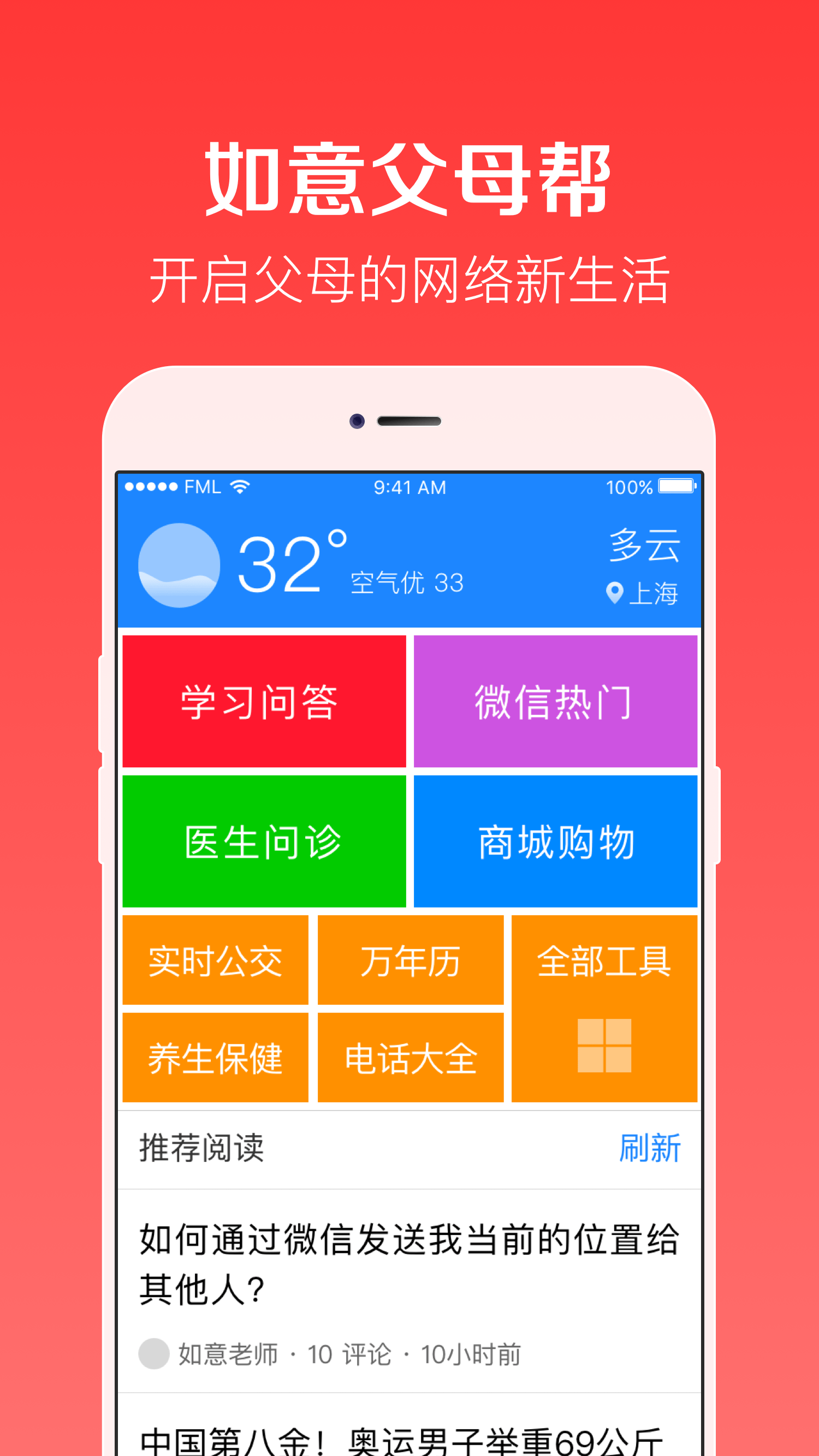 父母帮,帮父母!帮助中老年用户学习使用智能手机,提供问答教程、医生问诊、实用工具、资讯阅读等丰富的手机互联网服务。
