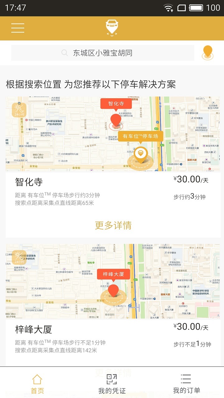 有车位停车提升停车服务的人文关怀。对上班族以及开车出行商务人士的停车痛点提出了有针对性的解决方案。车场选择覆盖全北京,用户可以在APP内直接搜索目的地附近的停车场,既可工作日下单,又可选择限行日和周末套餐。专属车位预订避免上班临时寻找车位的尴尬。有车位畅停包服务更是覆盖了北京国贸,望京,金融街,西单,中关村等主要商务场所。停车就用有车位,产品优惠尖叫不断,惊喜连连。