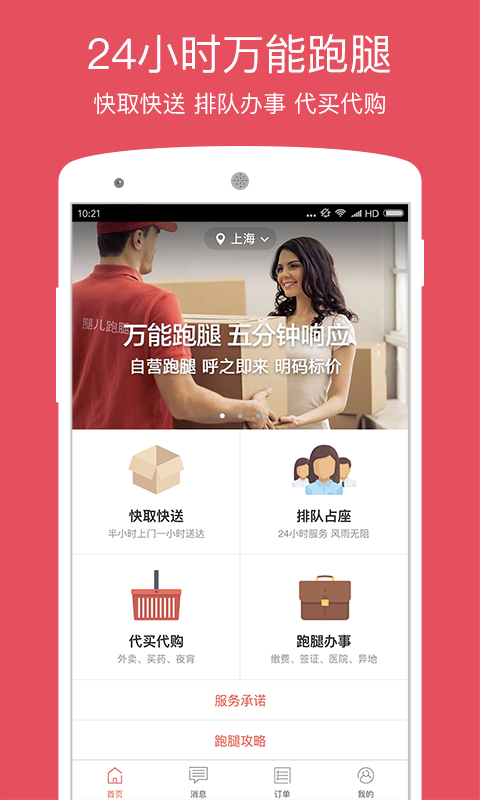 腿儿跑腿服务,24小时通宵服务,5分钟响应,目前服务上海地区,其他城市陆续开通。