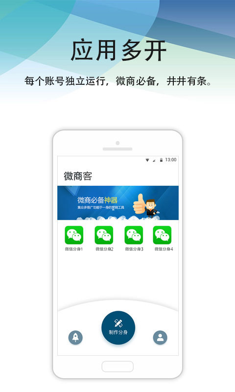 一部手机制作多个微信多开分身,多个微信账号同时在线,接收信息无需切换,真正的微商加粉助手。